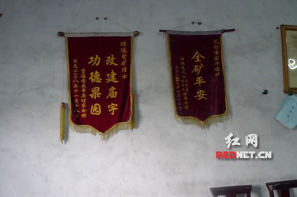 (记者看到矿上的会议室内共有两面锦旗,其中一面是捐建关帝庙的;另一面是捐建地母殿和观音殿的,庙祝送来锦旗祝捐赠者“全矿平安”。)