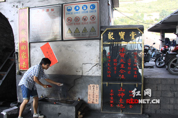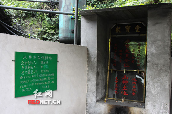 (在耒阳市导子乡群联村矿,各个井口都设有有香炉油灯,还有立有神位牌,供奉“七宝大王”、“招财童子”、“进宝郎君”“山神土地”等诸方神佛。)